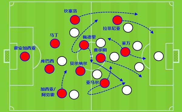 关键点还是因为有了佩德里,通过后者拖后,一来保证传球和推进的稳定性,二来也能做好攻防转换时的选位,这样一来,贝尔纳尔利用自己阅读比赛和洞察空间的能力适时前插,可以起到不错的效果。