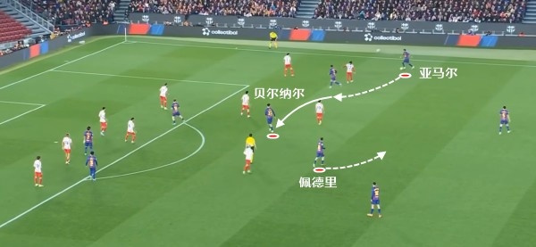 尤其是亚马尔持球从边路内切时,当佩德里向外线走,对方注意力自然会被带走,于是前顶到禁区前的贝尔纳尔就有了用武之地。