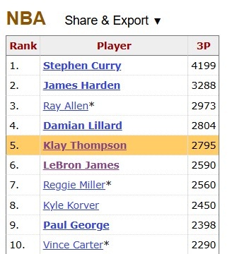 目前,汤普森距离超越利拉德(2804记三分)升至历史三分榜第四位仅差5记三分!