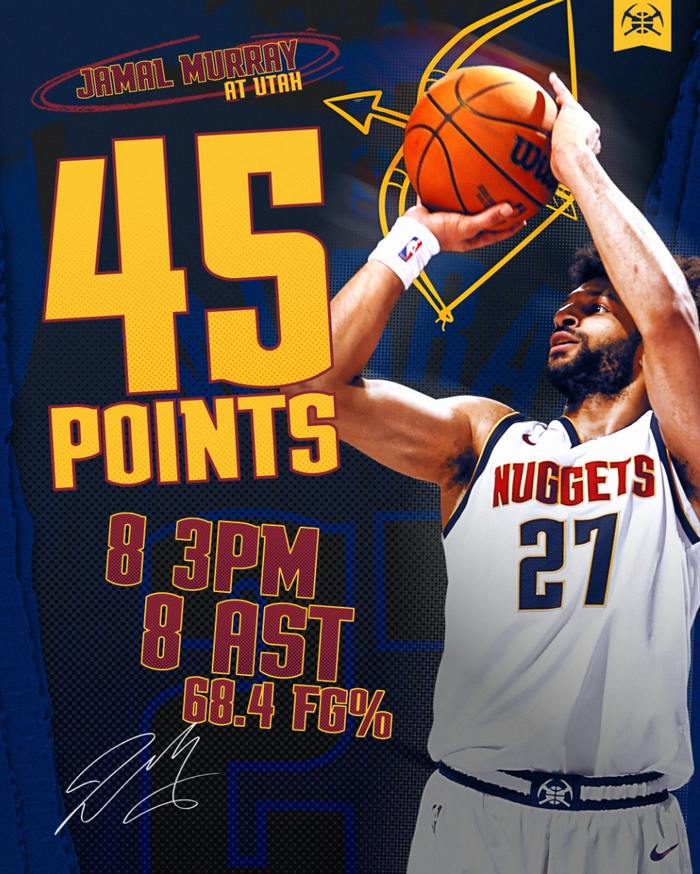 此役贾马尔-穆雷37分钟,19中13,三分13中8,罚球12中11,拿到45分8助攻2篮板2抢断7失误,命中率68.4%,三分命中率61.5%,真实命中率69.4%,正负值+2。